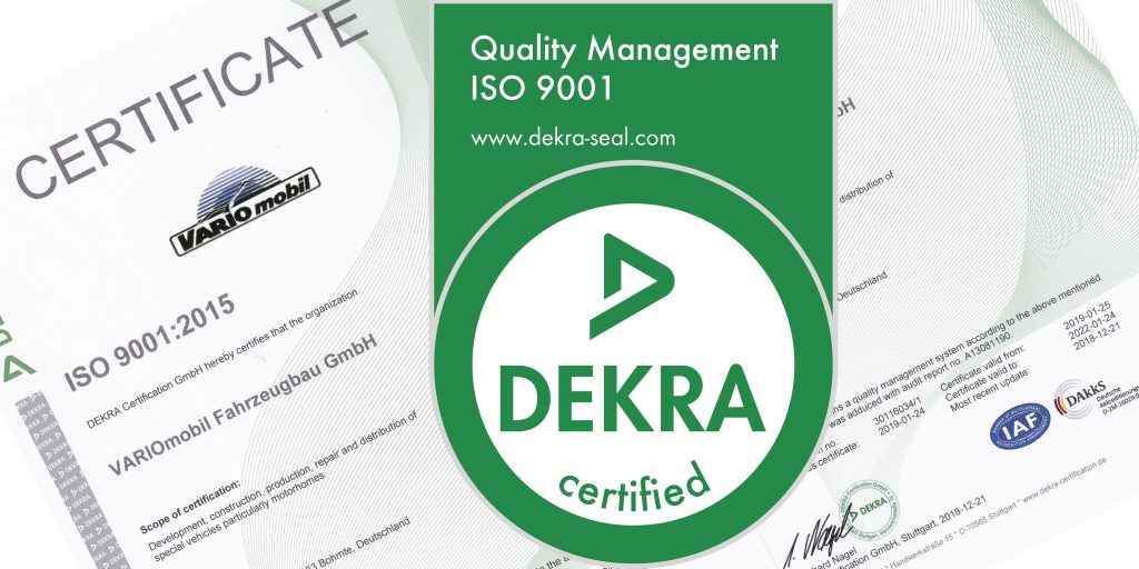 DEKRA has certified and repeatedly recertified us according to DIN EN ISO 9001:2015 in the areas of development, design, manufacturing, repair and sales of motorhomes and special-purpose vehicles. 100% SERVICE = 100% CUSTOMER SATISFACTION. Excellent service is standard with every VARIOmobil.