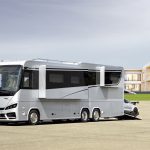 Motorhome VARIO Perfect 1200 Platinum | High-tech land yacht | 4 x extendable living-space slide-outs | Car garage with automated platform for sports cars up to the size of an AMG Black Series, alternatively accommodating a Harley-Davidson or even a classic cult moped, plus E-bikes on a separate VELO slide. Even more motorhome? Not possible.