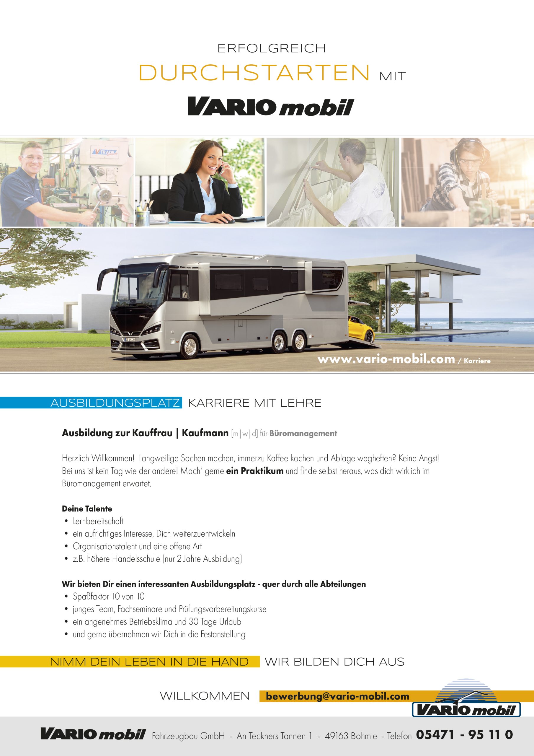 Noch Fragen? 05471-95 11 0. Bereit für Teamarbeit? Deine Zukunft? Das Neue? Dann los – pack’s an! Dazu E-Mail an bewerbung@vario-mobil.com.