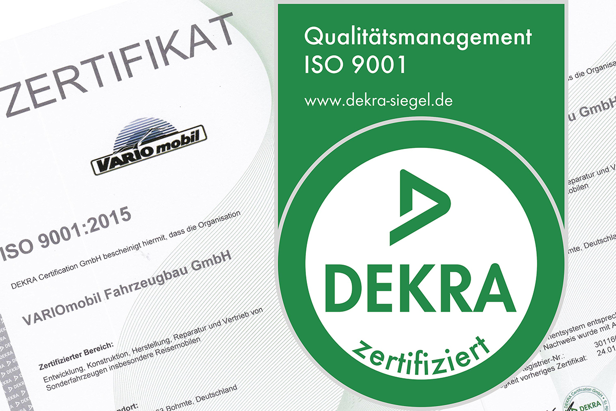 Die DEKRA Certification GmbH bestätigt VARIOmobil, dass am Standort 49163 Bohmte ein Qualitätsmanagementsystem entsprechend der Norm ISO 9001:2015 eingeführt wurde und aufrecherhalten wird. Zertifiziert wurden die Bereiche Entwicklung, Konstruktion, Herstellung, Reparatur und Vertrieb von Spezialfahrzeugen insbesondere Reisemobilen.